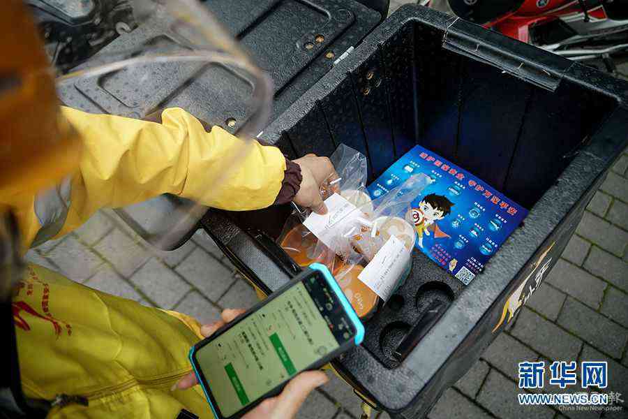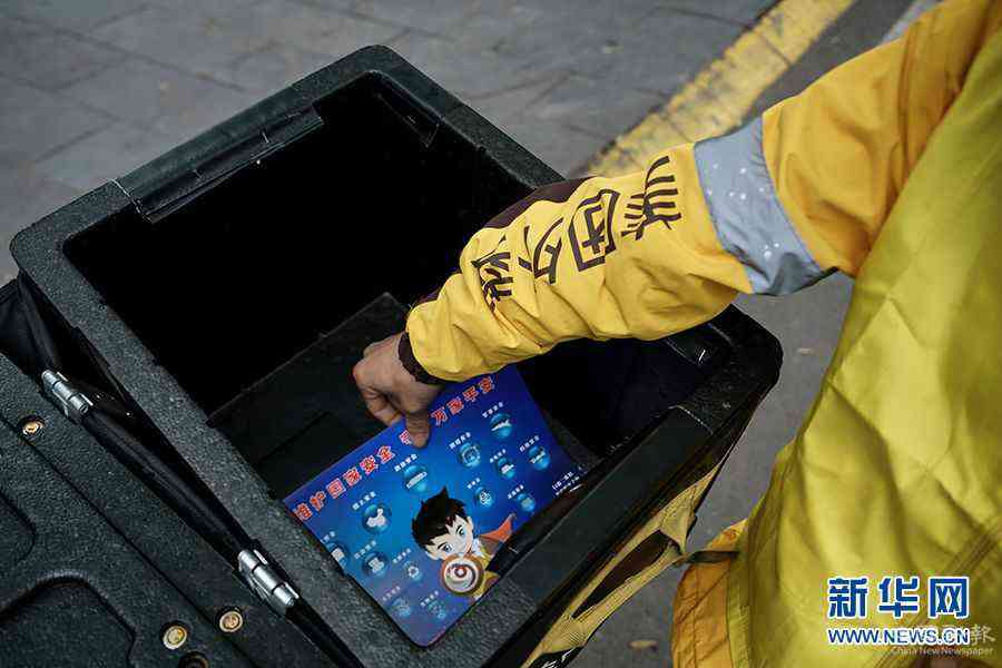 王淞將需要配送的餐飲品小心翼翼放到配送箱里,他要馬上趕到附近的居民小區(qū)按時完成此次配送。這幾天,沙坪壩區(qū)所有美團外賣的騎手車尾配送箱里,都擺放了這樣厚厚一疊的宣傳制品。新華網(wǎng) 韓夢霖 攝