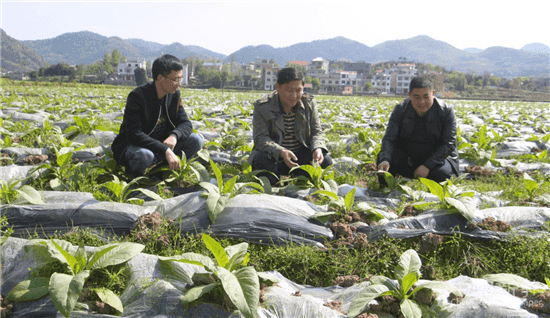 書記林順炳(中)和鄉(xiāng)長許斌(右)在煙田里了察看煙苗長勢
