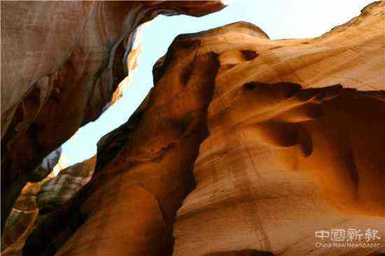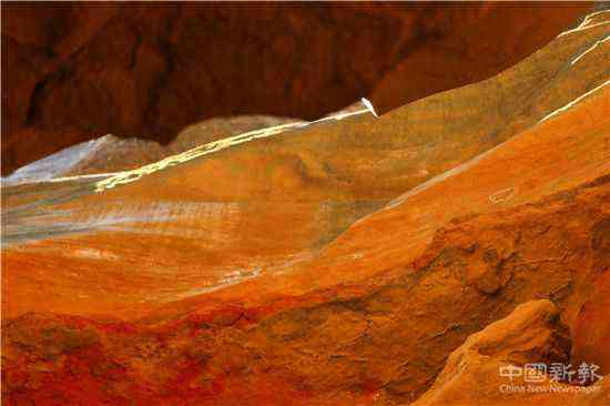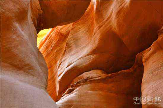 陽光從頭頂?shù)奶炜p里傾斜下來,像舞臺上的光束,緩緩的掃過地縫。黃色的砂巖在光影里呈現(xiàn)出各種暖色色階,像火焰在舞蹈,像絲綢在飄動,也像漣?在變幻。這是一個美輪美奐的光影夢境。