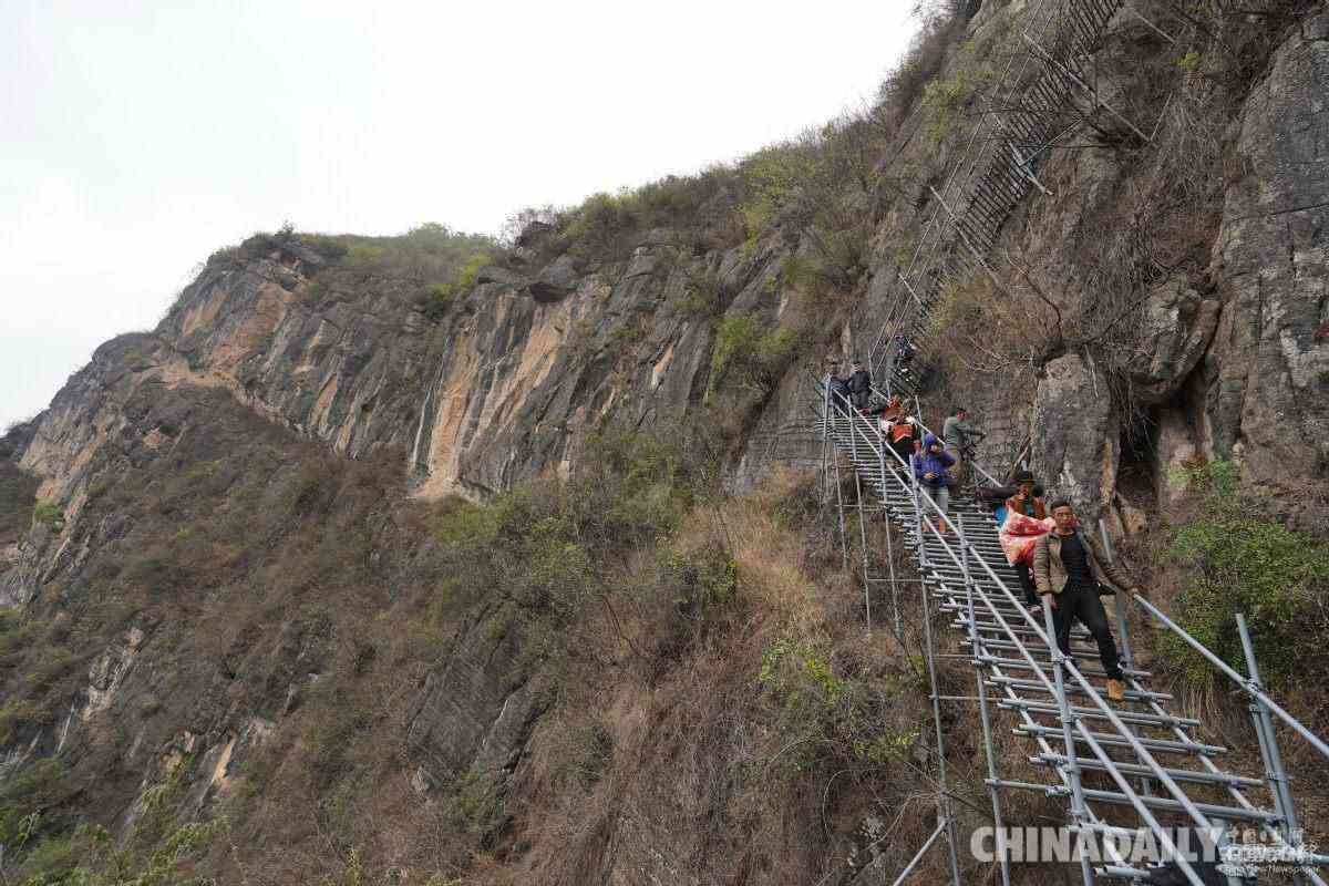 中國日報5月13日電 2020年5月13日,四川省涼山州昭覺縣支爾莫鄉(xiāng)阿土列爾村(“懸崖村”),村民走下鋼梯,搬進縣城新房。當日,居住于高山區(qū)、需攀爬鋼梯上下的特土組和勒爾組31戶貧困村民采取“人走鋼梯、行李走索道”的方式下山,在山腳牛覺組集中乘車,搬進位于縣城的新家。
