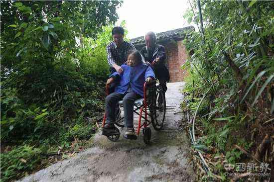 (王家河(左)與結(jié)對幫扶對象謝賢國一起推他妻子去醫(yī)院看病)