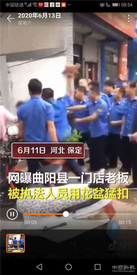 中國新報(bào)(記者 鄭平)昨晚(6月12日)有熱心網(wǎng)友給記者發(fā)來視頻,視頻顯示,身著城管執(zhí)法服的工作人員與一家店發(fā)生沖突,有一執(zhí)法人員用花盆砸向?qū)Ψ剑曨l字幕顯示事發(fā)河北曲陽縣。