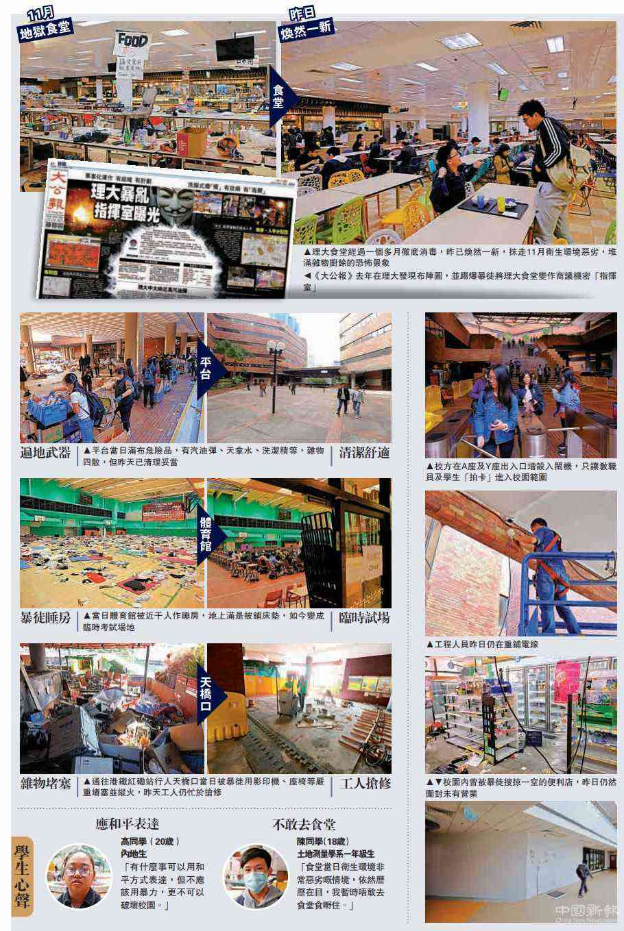 圖:理大食堂經(jīng)過一個多月徹底消毒,昨已煥然一新,抹走11月衛(wèi)生環(huán)境惡劣,堆滿雜物廚余的恐怖景象