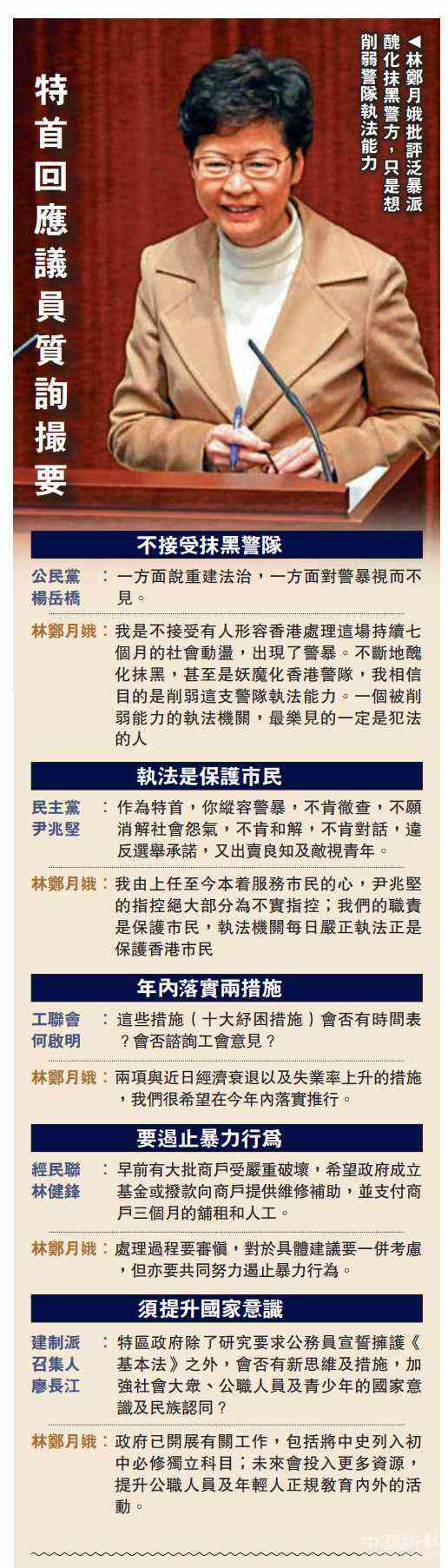 行政長官林鄭月娥昨日到立法會出席答問大會,力斥泛暴派抹黑警方。泛暴派漠視民生問題,不斷重復所謂“五大訴求”,還污蔑過去七個月出現(xiàn)“警暴”。林鄭月娥批評有人不斷丑化、抹黑,甚至妖魔化香港警隊,目的是削弱警隊執(zhí)法能力,對香港損害非常大。她強調(diào),若無人犯法,警方根本不會執(zhí)法,呼吁社會必須支持警方嚴正執(zhí)法。\大公報記者 龔學鳴(文)、攝影組(圖)