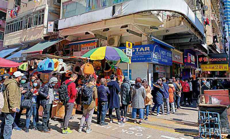 圖:市民在旺角弼街一間化妝品店外排起長(zhǎng)龍,希望能買(mǎi)到口罩