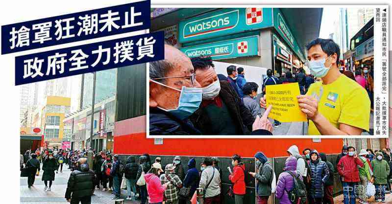 全港口罩短缺,多區(qū)連日出現(xiàn)人龍搶購口罩,昨日有大批市民冒著寒風(fēng)通宵排隊(duì)“攞籌撲罩”。特區(qū)政府昨日宣布,已經(jīng)與內(nèi)地港資企業(yè)及相關(guān)部門合作,短期內(nèi)將會(huì)有超過3000萬口罩供應(yīng)香港市場,當(dāng)中有800萬個(gè)口罩已運(yùn)抵本港,另外2400萬個(gè)口罩亦正安排。有議員建議,政府可統(tǒng)一分配口罩及其他防疫用品,在指定地點(diǎn)實(shí)名登記,“限價(jià)限購”,免口罩被囤積、倒賣,亦有議員提出應(yīng)立法禁止炒賣口罩、眼罩、洗手液、手套等防疫用品。\大公報(bào)記者 海芯葆、謝言