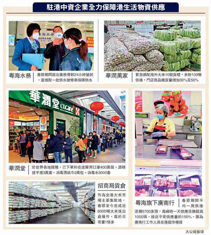駐港中資企業(yè)全力保障香港生活物資供應(yīng)。中資占香港零售市場的比重雖然不高,但憑藉自身經(jīng)營特色為香港市場的保供發(fā)揮了不可或缺的作用。華潤堂著力保障衛(wèi)生防護(hù)用品供應(yīng),已下單和在途醫(yī)用口罩400萬個(gè)、酒精搓手液3萬套、消毒濕紙巾2萬包、消毒水3000套;華潤萬家緊急調(diào)配海外大米10個(gè)貨柜、米粉100噸供港。招商局貨倉春節(jié)至今完成近6000噸大米進(jìn)出倉操作,高于日常量1倍多;粵海旗下廣南行春節(jié)期間平均一周供港活豬5700多頭,高峰時(shí)一天供應(yīng)活豬超過1000頭,接近平常供應(yīng)量的150%;粵海水務(wù)春節(jié)期間派出業(yè)務(wù)骨干24小時(shí)值班,并增配一批供水搶修車保障供水。