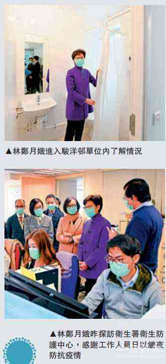 【大公報訊】鉆石公主號郵輪上的本港居民返港后將入住火炭駿洋邨接受14天強制檢疫。行政長官林鄭月娥昨日探訪衛(wèi)生署衛(wèi)生防護(hù)中心,亦前往駿洋邨了解相關(guān)準(zhǔn)備情況。她在社交網(wǎng)站致信郵輪上的港人,強調(diào)特區(qū)政府已就如何安全有序地接回船上的香港居民做好行動部署,希望大家保持心境平靜,預(yù)祝所有人返港一切順利。