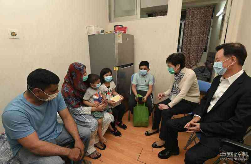 圖:林鄭月娥向少數(shù)族裔家庭派發(fā)口罩和其他日用品