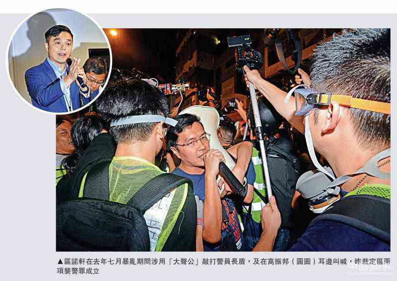 去年12月被法庭裁定在補選中“非妥為當(dāng)選”而喪失立法會議席的反對派前議員區(qū)諾軒,去年七月在九龍區(qū)騷亂期間,曾用“大聲公”(揚聲器)敲打警員長盾,及在警察公共關(guān)係科警司高振邦的耳邊叫喊,令高聽力受損。區(qū)辯稱只想引起注意,要求警員停止推進(jìn)。裁判官認(rèn)為區(qū)的辯解不合理,昨裁定區(qū)兩項襲警罪成立,先索閱社會服務(wù)令報告參考,但裁判官指出,判監(jiān)仍是判罰選項。區(qū)諾軒續(xù)準(zhǔn)保釋至4月24日候判。