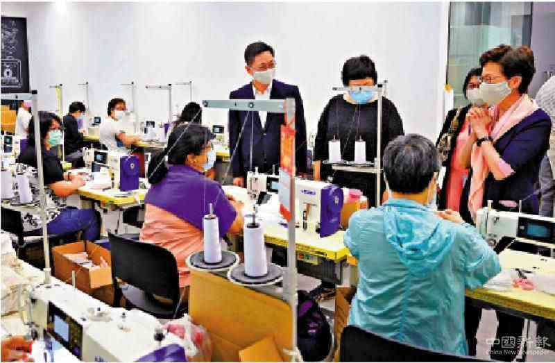 圖:林鄭月娥到口罩廠了解生產(chǎn)情況,并向紡織師傅及工友們致謝