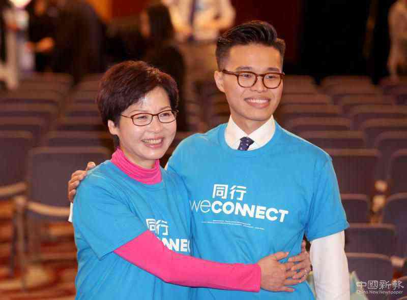 圖:林鄭月娥的長子林節(jié)思出席二〇一七年特首選舉造勢大會,為媽媽打氣