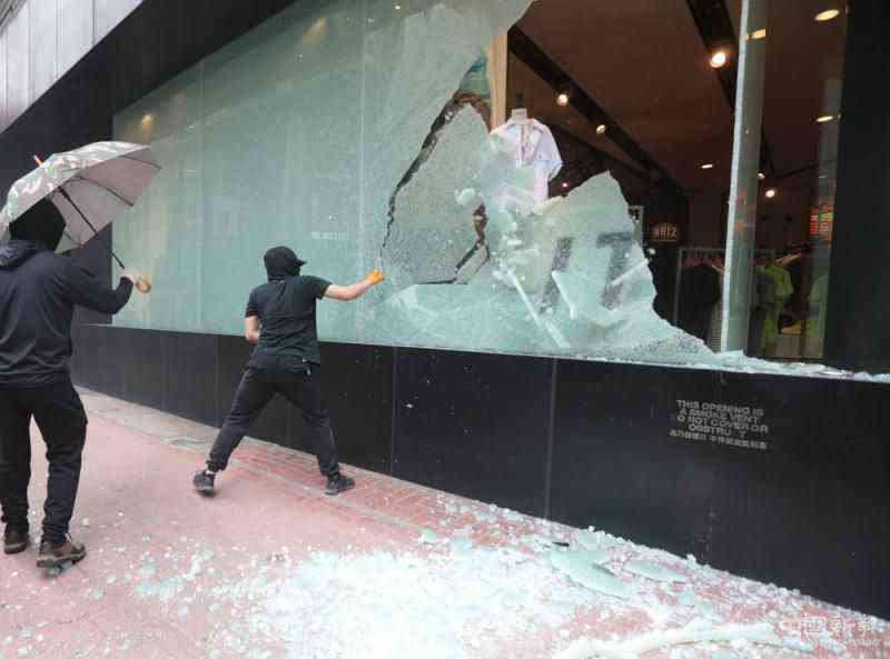 圖:暴徒在銅鑼灣打砸燒,IT時裝店成攻擊目標,大幅櫥窗玻璃遭毀壞