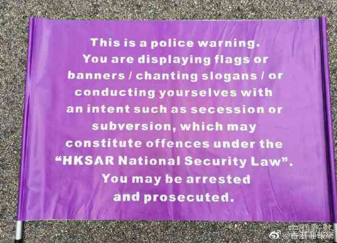根據(jù)港媒曝光的圖片,紫色的旗幟上分別用中文和英文寫(xiě)道:這是警方發(fā)出的警告,你們現(xiàn)在展示旗幟或橫幅,叫喊口號(hào)或其他行為,有分裂國(guó)家或顛覆國(guó)家政權(quán)等意圖,有可能構(gòu)成香港國(guó)安法的罪行,你們可能會(huì)被拘捕及刑事檢控。