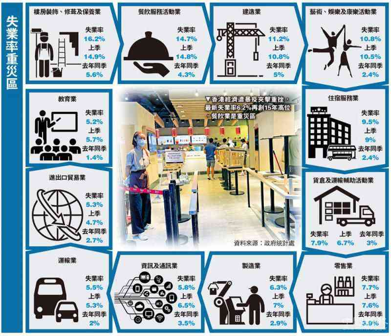 暴疫夾擊“打殘”各行各業(yè),本港最新失業(yè)率6.2%,較上一季再增加0.3個(gè)百分點(diǎn),再創(chuàng)15年高位。消費(fèi)及旅遊相關(guān)行業(yè)繼續(xù)成為重災(zāi)區(qū),當(dāng)中的餐飲服務(wù)活動(dòng)業(yè)(即飲食業(yè))失業(yè)率高踞14.7%,行內(nèi)開工不足的問題嚴(yán)重,就業(yè)不足率達(dá)到7.3%。另外,市道低潮令商戶暫停擴(kuò)充業(yè)務(wù),住戶不敢裝修,拖累樓房裝飾、修葺及保養(yǎng)業(yè)的生意大跌,行內(nèi)失業(yè)率攀升至16.2%,冠絕所有行業(yè)。
