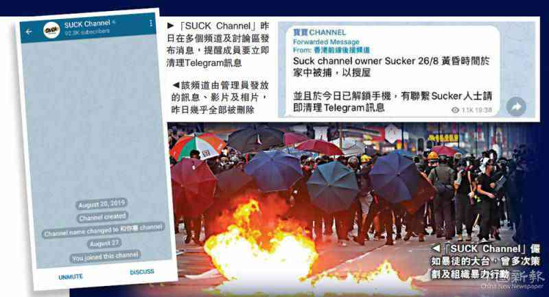 據(jù)了解,今次涉案人士為“SUCK Channel”管理員,網(wǎng)名“SUCKER”。昨早網(wǎng)上已傳出消息,“SUCK Channel”至少一名管理員被捕。該頻道即時(shí)一片風(fēng)聲鶴唳,并在多個(gè)Telegram頻道及“連登”討論區(qū)多處轉(zhuǎn)發(fā),提醒“手足”立即清理Telegram訊息。記者發(fā)現(xiàn),該頻道近日仍有更新,但由管理員發(fā)放的訊息、影片及相片則幾乎全部在昨早被刪除。
