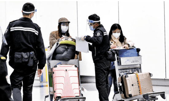 昨晚由英國抵港的旅客,在機(jī)場接受防疫安排。(大公文匯全媒體記者攝)