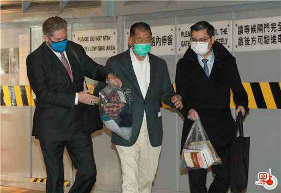 黎智英(中)獲準(zhǔn)保釋后,本月23日深夜離開(kāi)高等法院羈留室。(大公文匯全媒體記者攝)