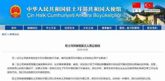 據(jù)中國駐土耳其大使館網(wǎng)站消息,近日土耳其多地發(fā)生針對中國的游行示威,引發(fā)關注。使館發(fā)言人昨在答記者問時指出,對此高度關切并感到擔憂。