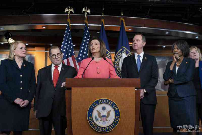 圖:美國眾議院議長佩洛西(中)介紹彈劾“管理人”\美聯(lián)社
