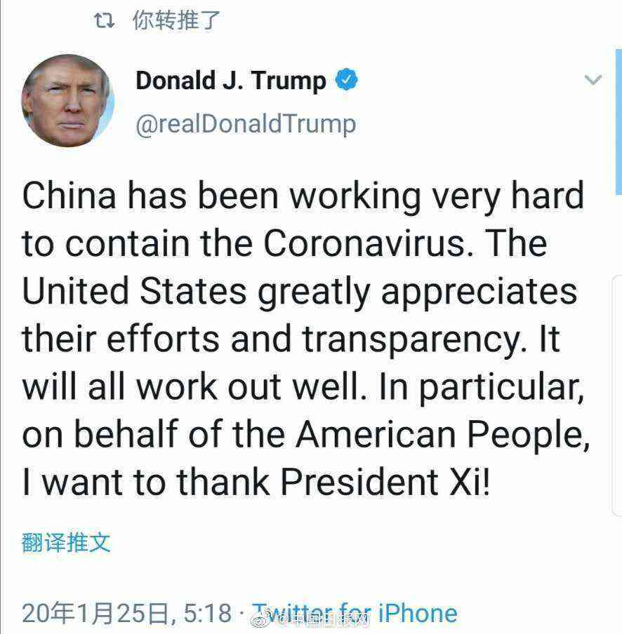 中國日報網1月25日電 剛剛,美國總統(tǒng)特朗普發(fā)推特表示,中國正在盡力遏制新型冠狀病毒,美國非常欣賞他們的努力和透明性。問題將會得到解決,“我要特別代表美國人民感謝習主席????”。
