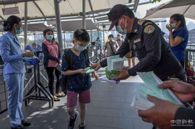 圖:衛(wèi)生官員在曼谷的商場(chǎng)前分發(fā)口罩/美聯(lián)社