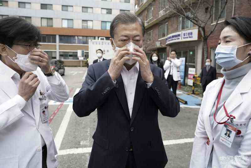 圖:韓國總統(tǒng)文在寅(中)28日視察首爾國立中央醫(yī)療院/美聯(lián)社