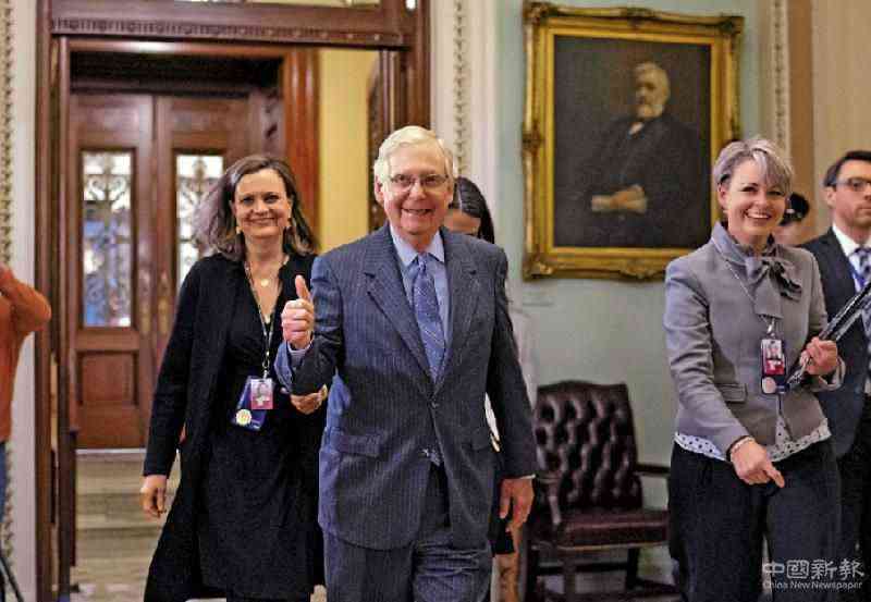 圖:參議院多數(shù)黨領(lǐng)袖麥康奈爾1月31日離開(kāi)議事廳時(shí)豎起大拇指\美聯(lián)社