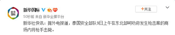新華社快訊:據(jù)外電報(bào)道,泰國(guó)安全部隊(duì)9日上午在東北部呵叻府發(fā)生槍擊案的商場(chǎng)內(nèi)將槍手擊斃。