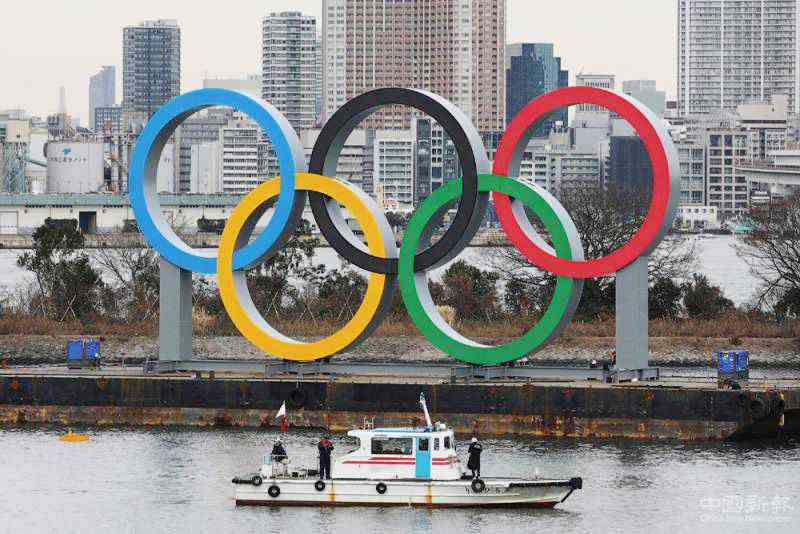 圖:豎立在東京灣海面上的五環(huán)標(biāo)志(新華社記者杜瀟逸攝)