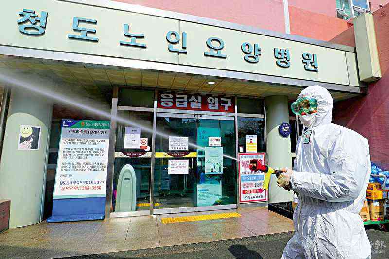 資料圖:韓國(guó)大邱檢疫人員在醫(yī)院前消毒\美聯(lián)社