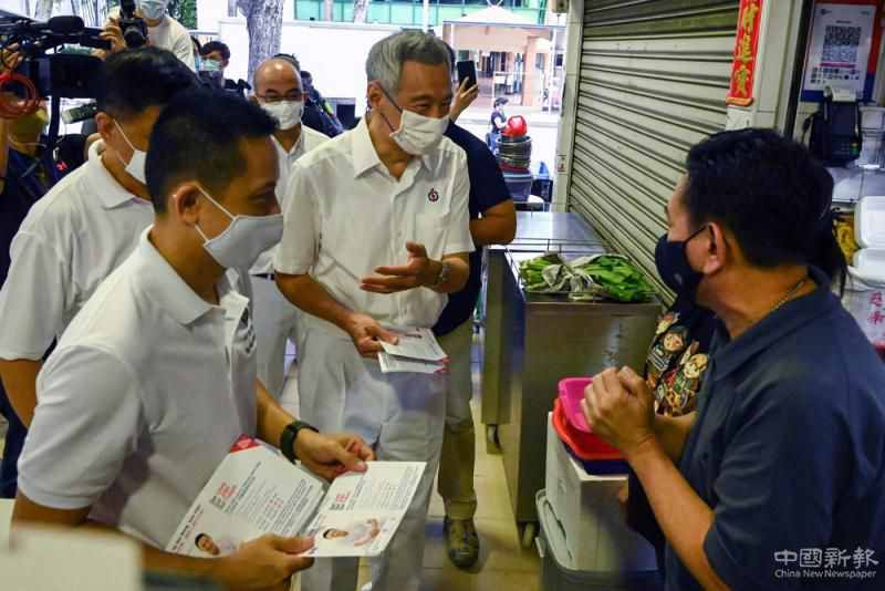 圖:新加坡總理李顯龍(中)3日走訪選區(qū)與選民交談\法新社