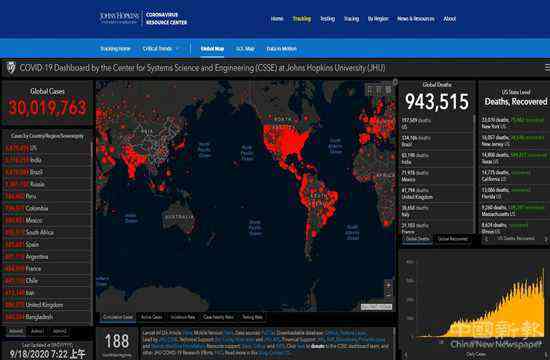 據(jù)美國約翰·霍普金斯大學(xué)實時統(tǒng)計數(shù)據(jù)顯示,目前全球新冠肺炎累計確診超3000萬例,達(dá)30,019,763例,累計死亡943,515例,累計確診國家和地區(qū)數(shù)188個。