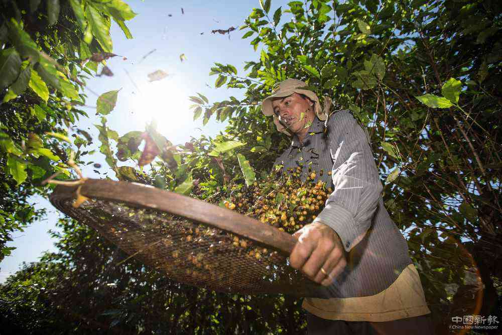 2017年6月,在位于巴西圣洛倫索的塞爾當(dāng)莊園,一名工人篩出咖啡果實中摻雜的葉子。(新華社記者李明攝)