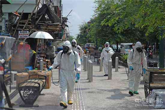 疫情嚴峻,印度有醫(yī)護人員在街道上噴灑消毒液。(新華社資料圖片)