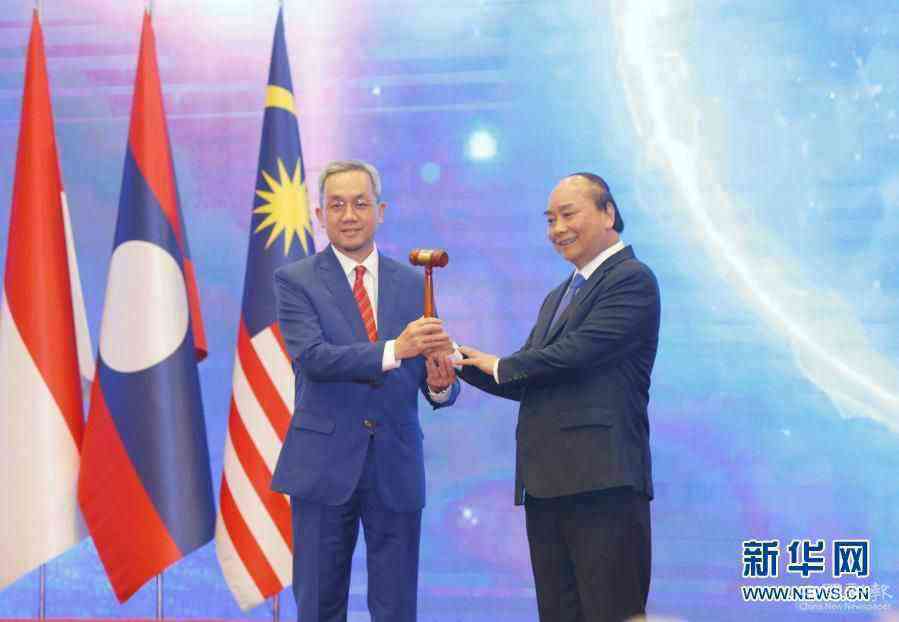 11月15日,在越南首都河內(nèi)舉行的第37屆東盟峰會(huì)及東亞合作領(lǐng)導(dǎo)人系列會(huì)議閉幕式上,越南總理阮春福(右)將象征東盟輪值主席國(guó)身份的木槌移交給文萊駐越南大使。新華社/越通社