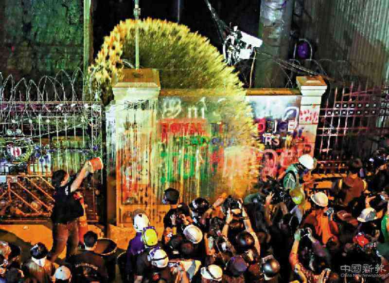 圖:泰國(guó)示威者向曼谷警察總部潑油漆/路透社