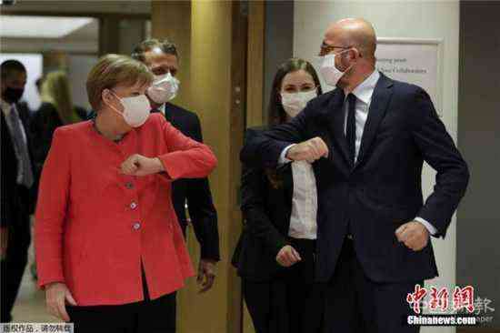 資料圖:當(dāng)?shù)貢r(shí)間2020年7月17日,在比利時(shí)布魯塞爾,出席歐盟面對(duì)面峰會(huì)的各國(guó)政要“撞肘”互相問(wèn)候。圖為德國(guó)總理默克爾(左)與歐洲理事會(huì)主席米歇爾(右)“撞肘”問(wèn)候。