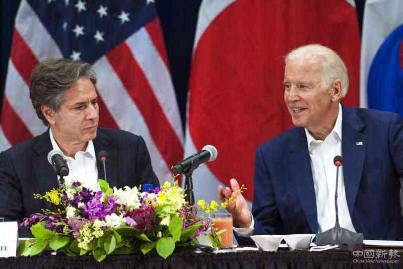 圖:2016年7月,時(shí)任美國副總統(tǒng)拜登(右)在夏威夷與日韓領(lǐng)導(dǎo)人舉行會(huì)談,圖為他與布林肯(左)在會(huì)場(chǎng)交談\資料圖片