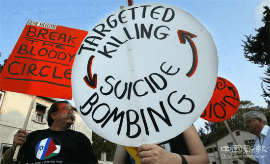 以色列左翼人士在位于特拉維夫的以色列國(guó)防部外抗議定點(diǎn)清除,圖中標(biāo)語(yǔ)表示定點(diǎn)清除會(huì)和自殺式襲擊形成惡性循環(huán)