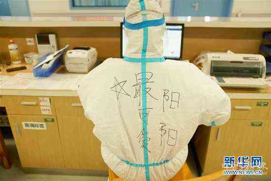 護(hù)士邊關(guān)月的防護(hù)服上寫著“陽陽最可愛”(2月18日攝)。邊關(guān)月連續(xù)20多天奮戰(zhàn)在一線沒有回家,她希望兒子陽陽能像太陽一樣,給自己能量。