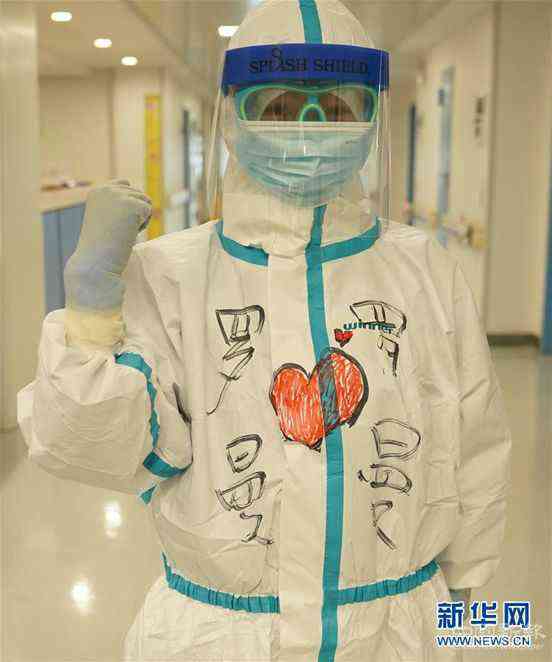 護(hù)士羅曼的防護(hù)服上畫著“紅心”(2月18日攝)。她希望病人看到紅火的愛心,內(nèi)心充滿溫暖。 新華社記者 王毓國 攝