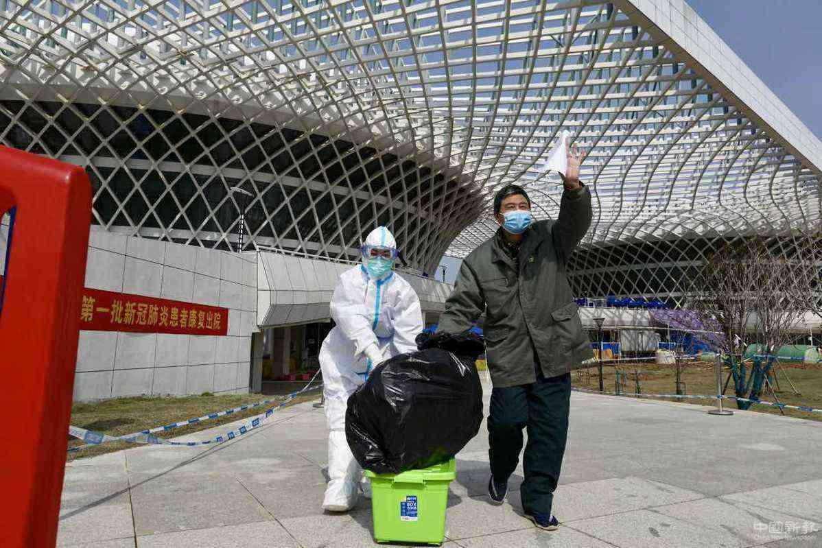 3月10日,治愈患者在醫(yī)務(wù)人員陪伴下走出江夏方艙醫(yī)院。(中國(guó)日?qǐng)?bào)記者 朱興鑫 攝)