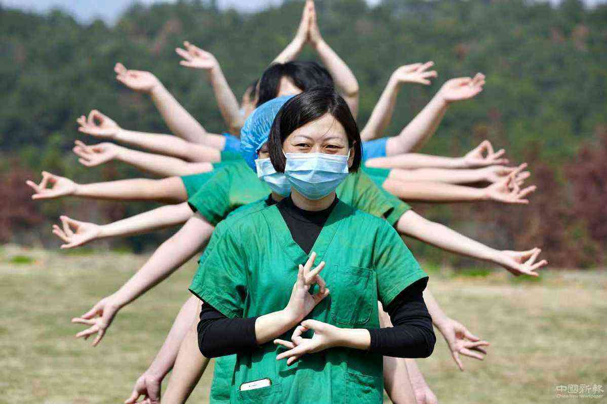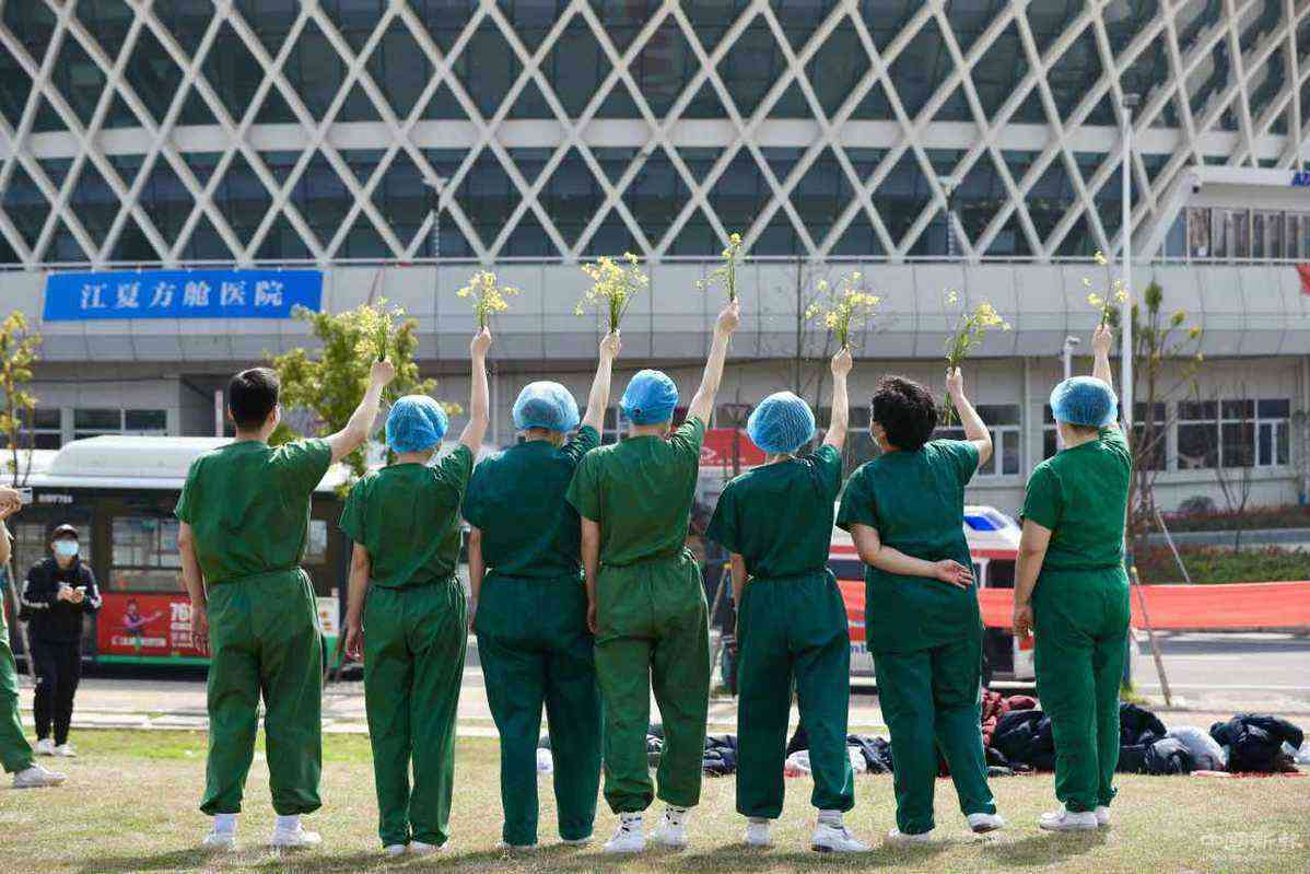 3月10日,在江夏方艙醫(yī)院,醫(yī)務(wù)人員揮手告別。(中國(guó)日?qǐng)?bào)記者 朱興鑫 攝)
