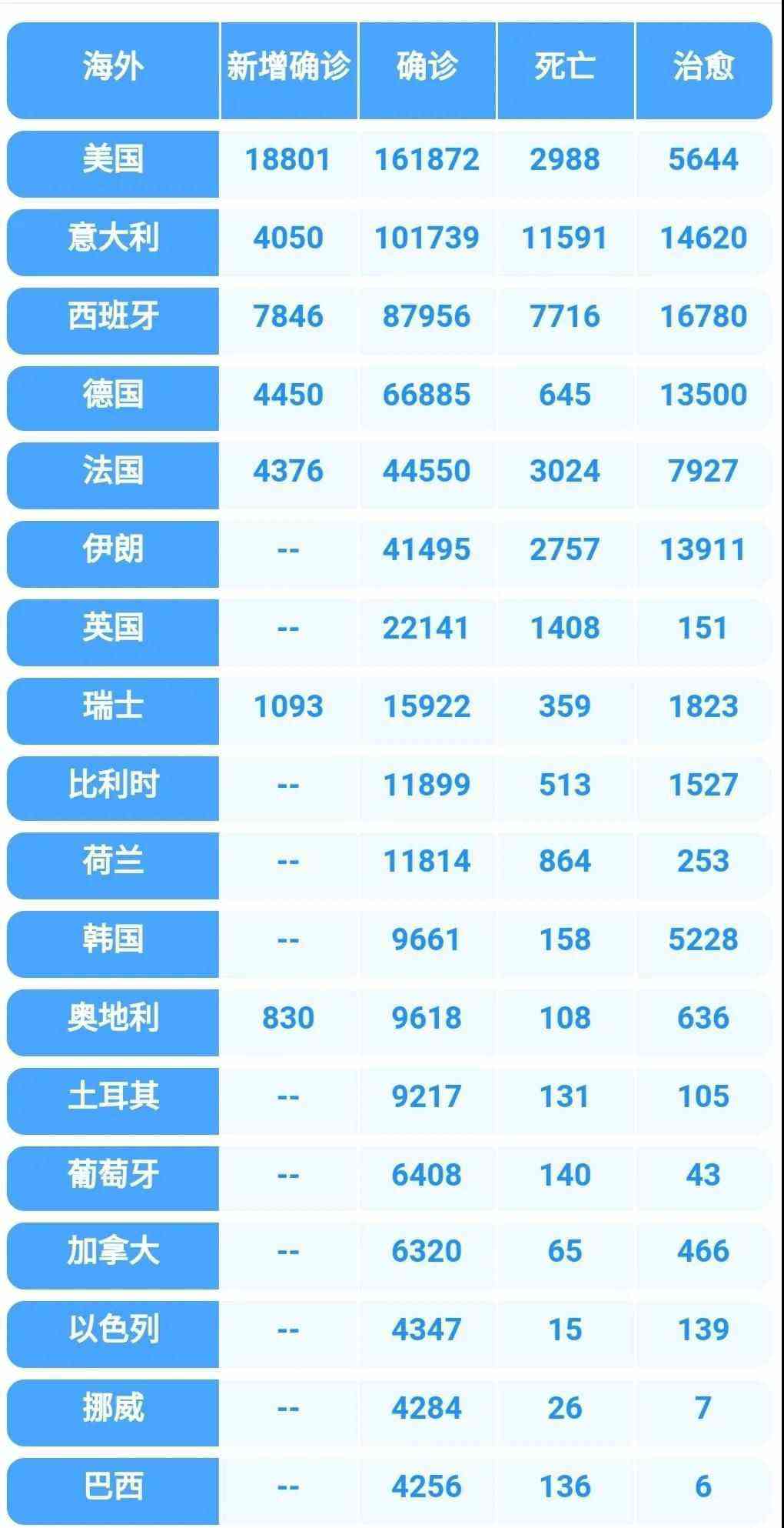 據(jù)美國約翰斯·霍普金斯大學發(fā)布的全球新冠肺炎疫情實時統(tǒng)計系統(tǒng),截至美國東部時間3月30日晚6點,全美共報告新冠肺炎確診病例161367例,死亡2956例,治愈5595例。在過去24小時,全美新增確診病例21692例,新增死亡病例520例。其中,紐約州的確診患者66497例,紐約市37453例。(人民日報客戶端)