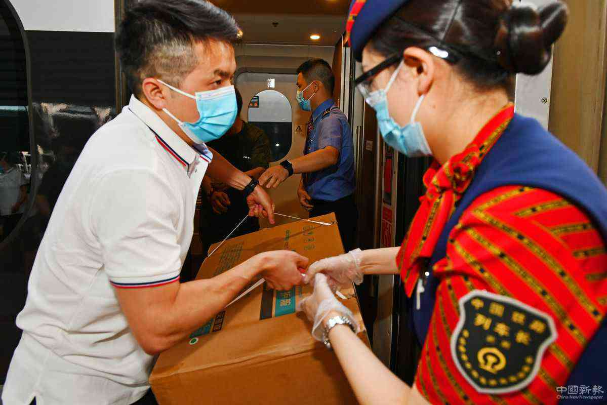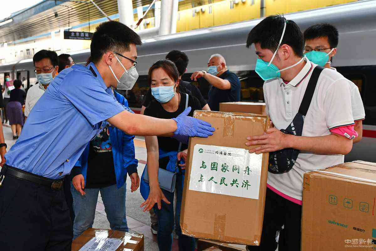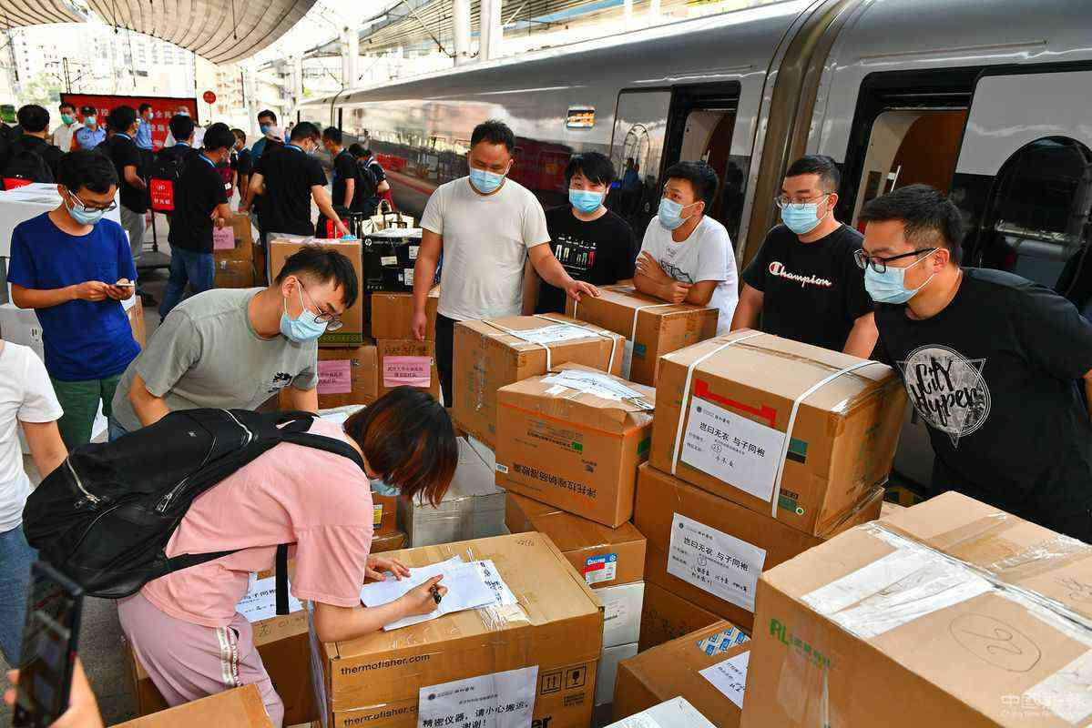 6月20日,北京西站,武漢醫(yī)療隊(duì)在搬運(yùn)防疫物資。 孫立君 攝