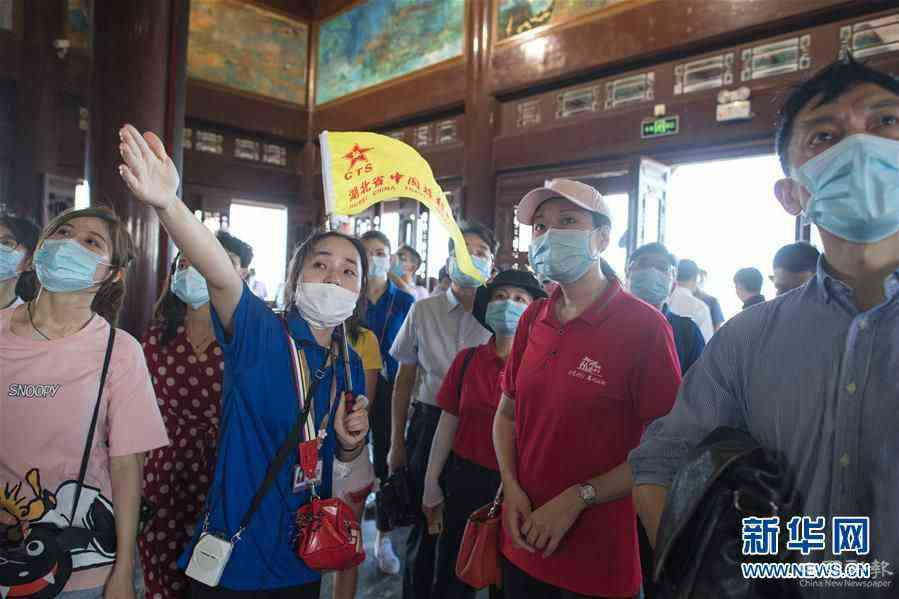 8月7日,導(dǎo)游在黃鶴樓景區(qū)為受邀來湖北旅游的援鄂醫(yī)療隊(duì)員講解。