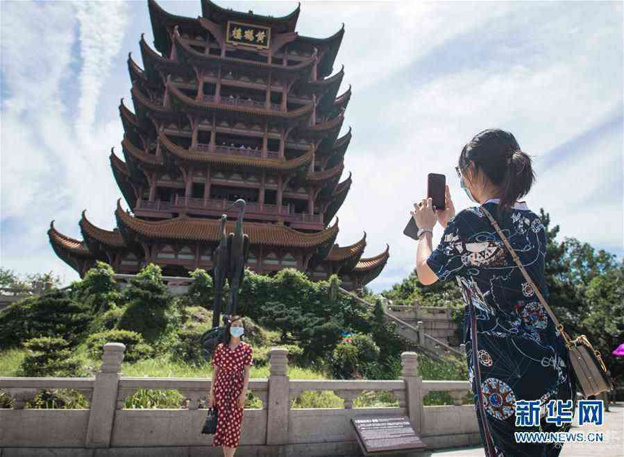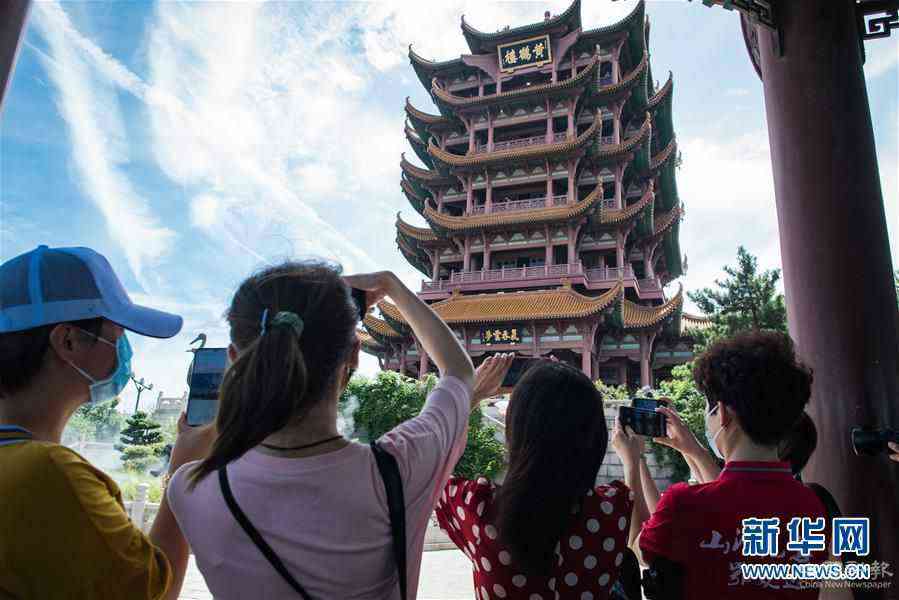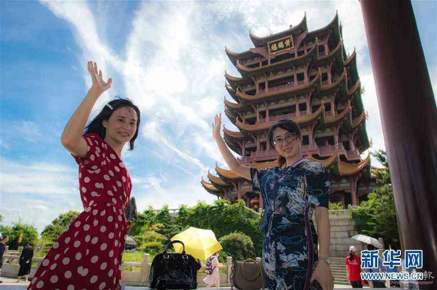 8月7日,受邀來湖北旅游的援鄂醫(yī)療隊(duì)員在黃鶴樓景區(qū)拍照。新華社記者 肖藝九 攝