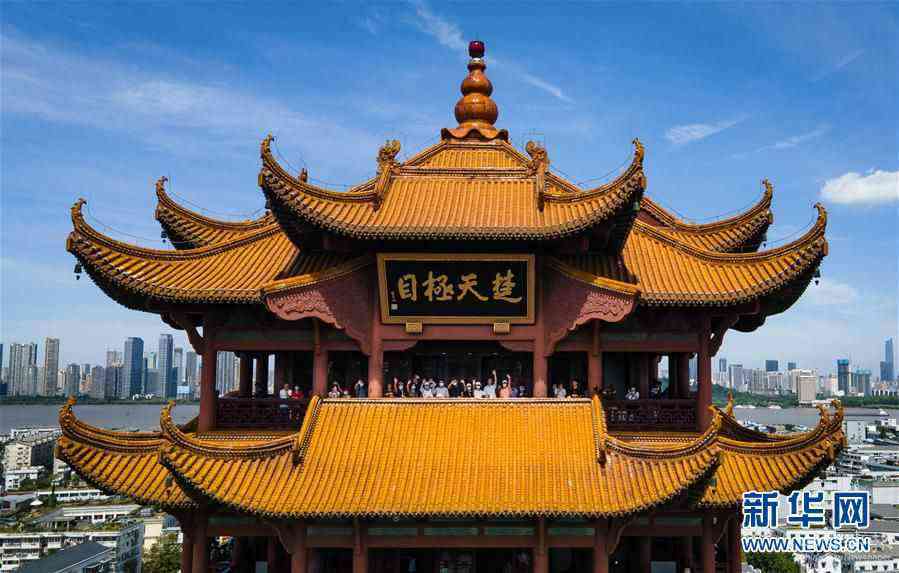 8月7日,受邀來湖北旅游的援鄂醫(yī)療隊(duì)員在黃鶴樓景區(qū)游覽(無人機(jī)照片)。新華社記者 肖藝九 攝