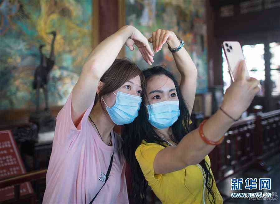 8月7日,受邀來湖北旅游的青海援鄂醫(yī)療隊(duì)員雷占玲(右)在黃鶴樓景區(qū)自拍。新華社記者 肖藝九 攝
